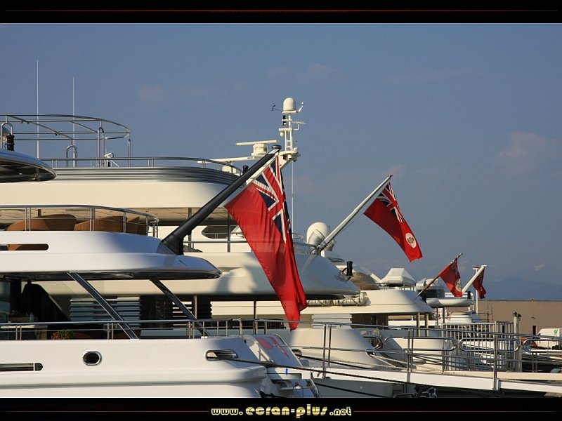 Déclinaison de pavillons des Antilles britanniques sur le quai des milliardaires au port Vauban - Antibes (06) - © EcranPlus