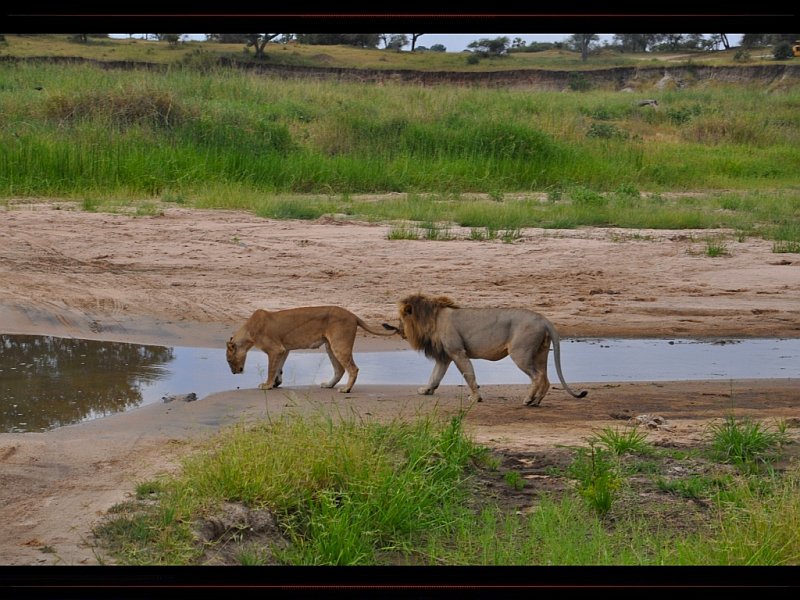 Couples de lions au bord d`un point d`eau en Tanzanie - © mamour