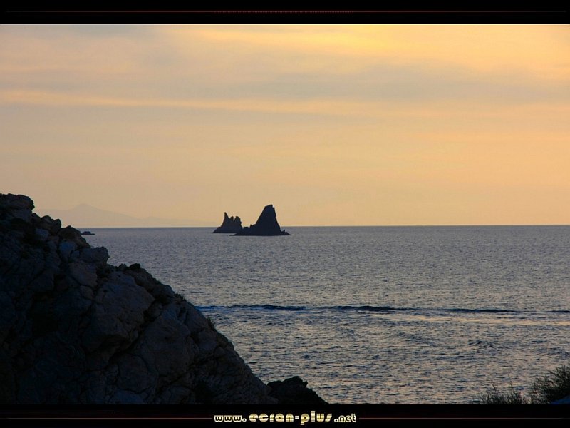 Coucher de soleil sur les rochers au large de l`entrée du port de Paros - Cyclades - Grèce - © EcranPlus