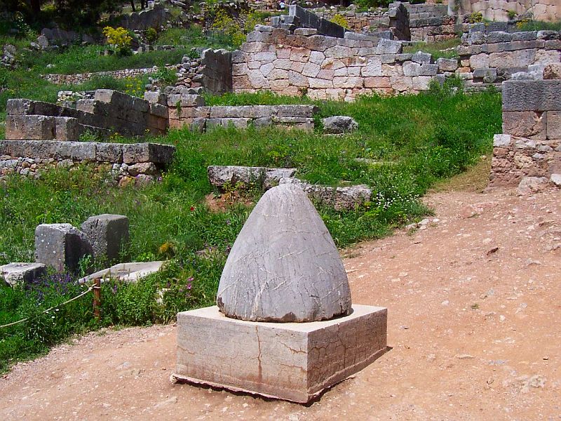 Pour la petite histoire : Un jour, le roi de l'Olympe lache 2 aigles, l'un en direction du levant, l'autre vers le couchant : à l'emplacement précis où les 2 oiseaux se rencontrent, il laisse tomber un betyle ( une pierre sacrée ) pour marquer le centre du monde ou nombril de la terre.