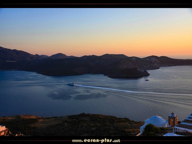 Ferry dans la passe de la baie de Milos au coucher de soleil - Cyclades - Grèce - © EcranPlus