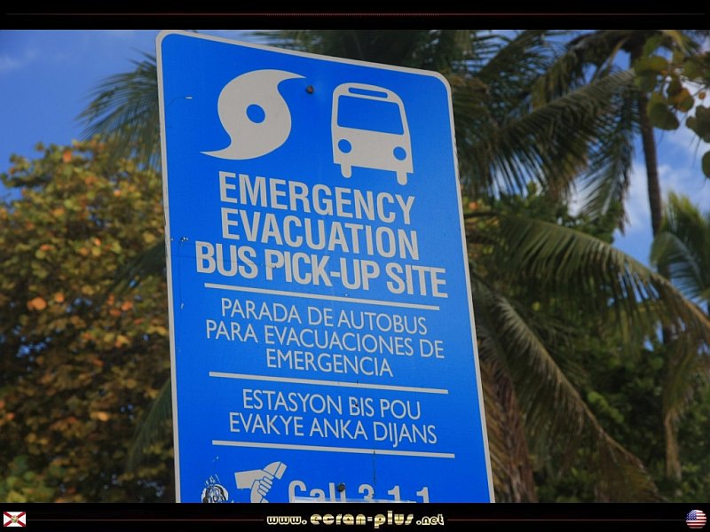 Panneau d`évacuation en cas de cyclone, en Anglais, en Espagnol et en Créole, rapelant que la Floride fait partie de la Caraïbe - Ocean Drive - Miami Beach - Floride - USA - © EcranPlus