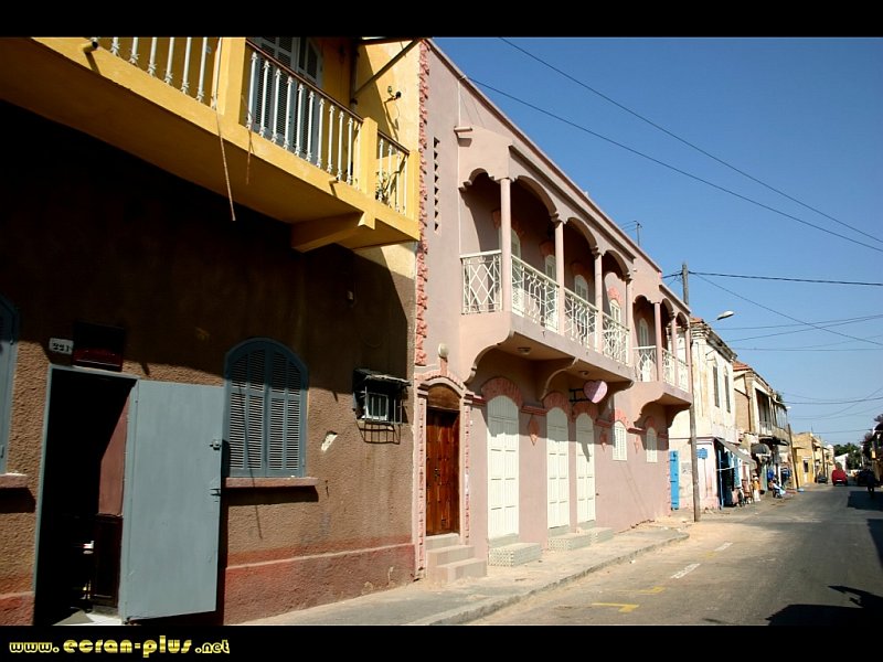 Jolie vue de cette rue de la ville coloniale. Ce quartier est bati sur une île du fleuve Sénégal. Elle est reliée au continent à l'est par le pont Faidherbe, et à la langue de Barbarie abritant notamment lequartier des pecheurs à l'ouest.