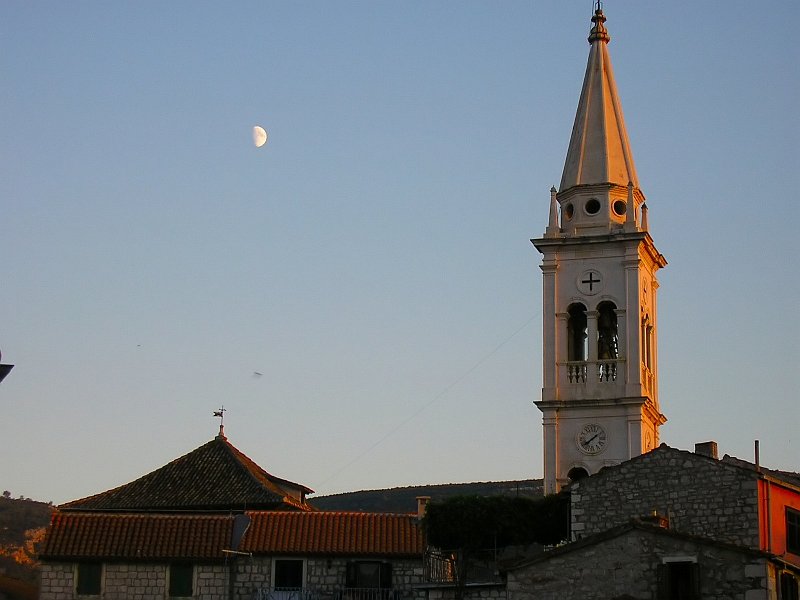 Superbe photo. La luminosité sur le clocher est magnifique, et le cadrage est parfait avec la lune dans le ciel.
