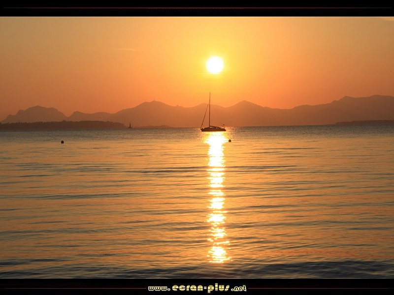 Bateau dans le coucher de soleil sur l`Esterel et la baie de Juan les Pins (06) - © EcranPlus